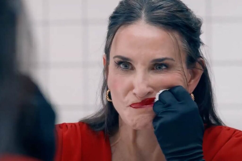 A Substância vai denunciar o mito através de personagens que seriam elas mesmas propagadoras inconscientes do ideal de beleza inexequível, e simultaneamente, as vítimas primeiras nesse ciclo: as estrelas de cinema. Elisabeth Sparkle (Demi Moore) é uma atriz cuja carreira é sintetizada pela estrela que ganha na calçada da fama, que é moldada especificamente para ela. No seu auge é altamente procurada, admirada e fotografada. A passagem do tempo vai fazer a marca sofrer rachaduras, ser pisoteada em meio ao esquecimento até que alguém derrube restos de alimento sobre ela. A repugnância desse gesto, o alimento industrializado caído sobre a estrela, é o resumo de como a Sparkle que passou dos 50 anos é vista pela indústria que a sustenta. Além de representar toda a repulsa que será altamente potencializada nesse body horror que monstrualiza o mito da beleza.