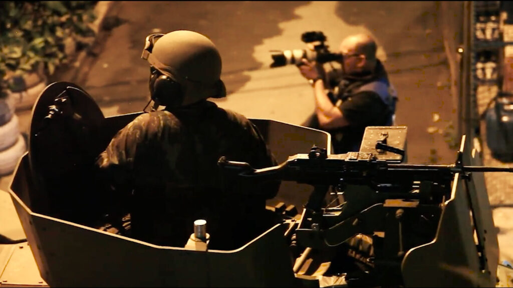 Gizele Martins: Inúmeros filmes falam sobre a favela e as violações, mas de forma muito sensacionalista. No caso dos filmes famosos que ganharam o mundo. Aqui, a gente quis trazer uma abordagem de respeito, de ética. Toda a narrativa foi construída com os nossos protagonistas, para saber se eles gostavam da imagem ou não, e o que era prioritário para eles. Isso trouxe o aspecto de subjetividade, porque além da violência física, existe uma violência psíquica, sobre a qual não se fala. A gente vive com isso desde 2014, ou desde as experiências das favelas vivendo sob operações policiais, com assassinatos, chacinas todos os dias, helicópteros atirando nas escolas. Então a gente precisava trazer o som. Queria que as pessoas na sala de cinema sentissem um pouquinho do que é ouvir o barulho do tanque. Esse som me persegue até hoje quando eu tento dormir. O barulho do tanque me acompanha aqui, me acompanha quando eu estou andando na rua. Eu tenho pesadelos com o tanque 24 horas, não é só dormindo, mas acordada também. Essa é a experiência de viver num território militarizado, violado.