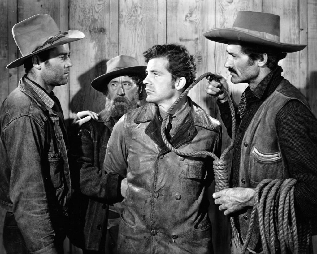 Fato é que, apesar de não ter tido o reconhecimento pela maior premiação do Cinema, o western perpassa toda história da cinematografia, com altos e baixos, mas sempre se reinventando. Consciências Mortas, dirigido por William Wellman, é um bom exemplo: o filme se utiliza do gênero para contar uma história muito mais complexa do que perseguições a cavalo e tiroteios (subversão que o crítico André Bazin chamaria de metawestern). Com pouco mais de uma hora de duração, o filme tem uma força devastadora. Henry Fonda é o grande astro que nos guia o incidente de Ox-Bow. Após o suposto assassinato de um vaqueiro popular na cidade de Bridger’s Wells, o povo se reúne sedento por vingança. O frágil moralismo daquelas pessoas é logo quebrado e revela os olhares violentos e julgadores dos cidadãos comuns e de bem que partem em uma jornada pela justiça com as próprias mãos.