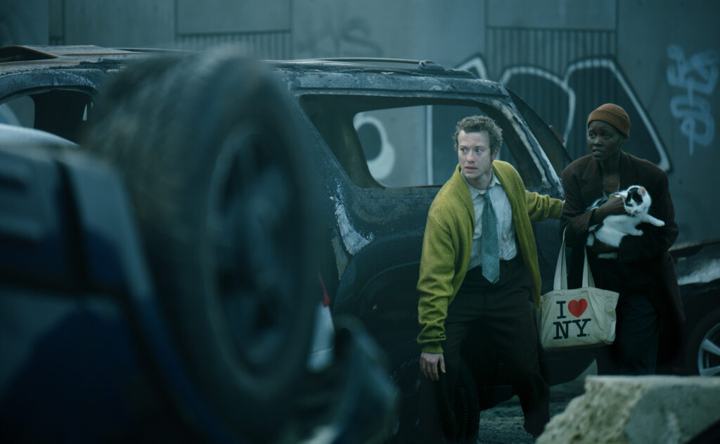 Em poucos instantes as ruas já estão totalmente caóticas e devastadas, as saídas do metrô inundadas e as pessoas andando em bandos silenciosos ou escondidas dentro de algum abrigo urbano. Frodo, o gato, é trabalhado como um personagem dentro do filme, não só como um companheiro de Samira. Por vezes ele se perde, se separa da dona, se desloca pelas ruas sob ataque, onde restam poucos grupos de humanos à deriva. Certos momentos, passa por causalidades bastante improváveis, mas que a gente releva pelo poder carismático do bichinho. Em uma saída subterrânea cheia de água, Frodo encontra Eric (Joseph Quinn), um homem jovem, amedrontado e sozinho, que, poucos metros à frente, encontra Samira em um beco, remoendo ter se separado de Frodo. Se forma então um trio, acidental e desajeitado, que vai passar pelos terrores dos acontecimentos juntos daí por diante.